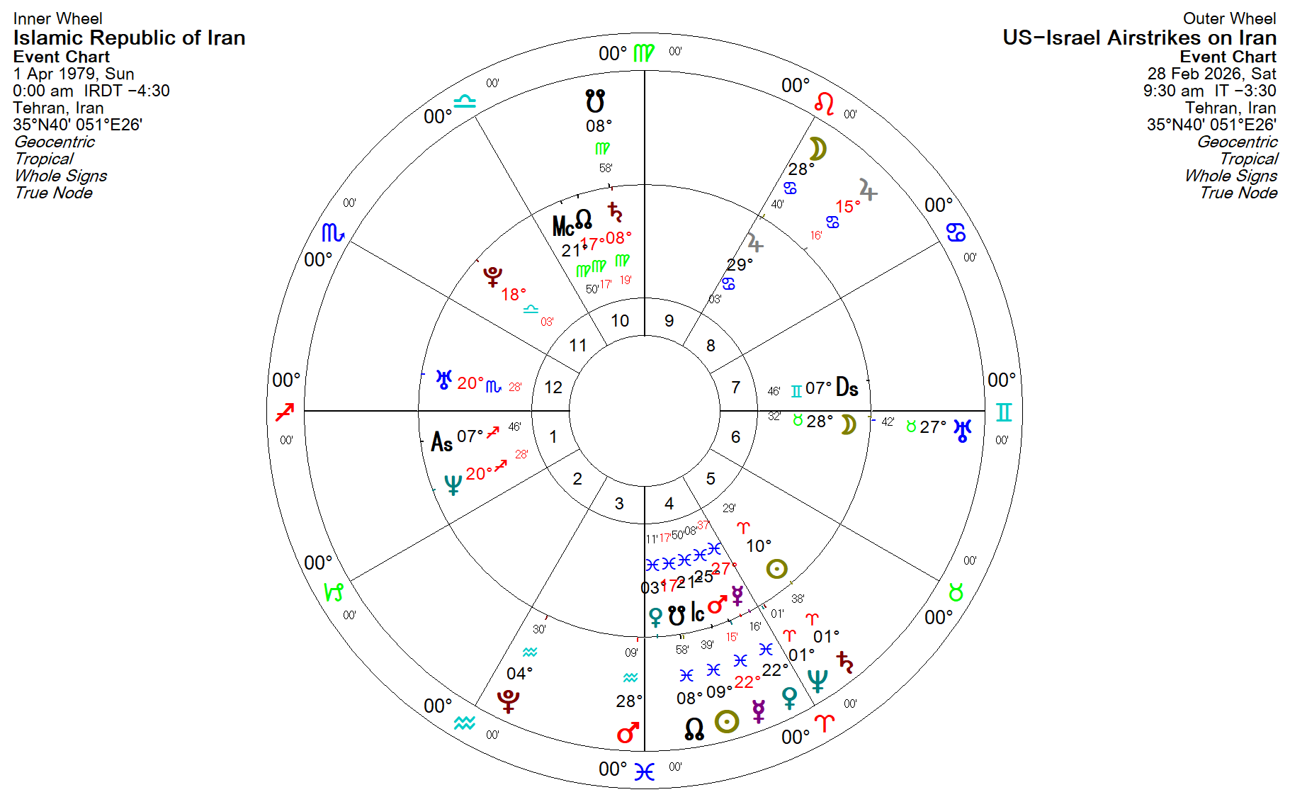 Those are the major astrological signatures, but even more so than that, Iran’s natal chart is absolutely lit up by the current transits. Here’s a bi-wheel showing Iran’s natal chart on the inner wheel with the chart of the US-Israel airstrikes on the outer wheel (I got the time for the airstrikes from this article):